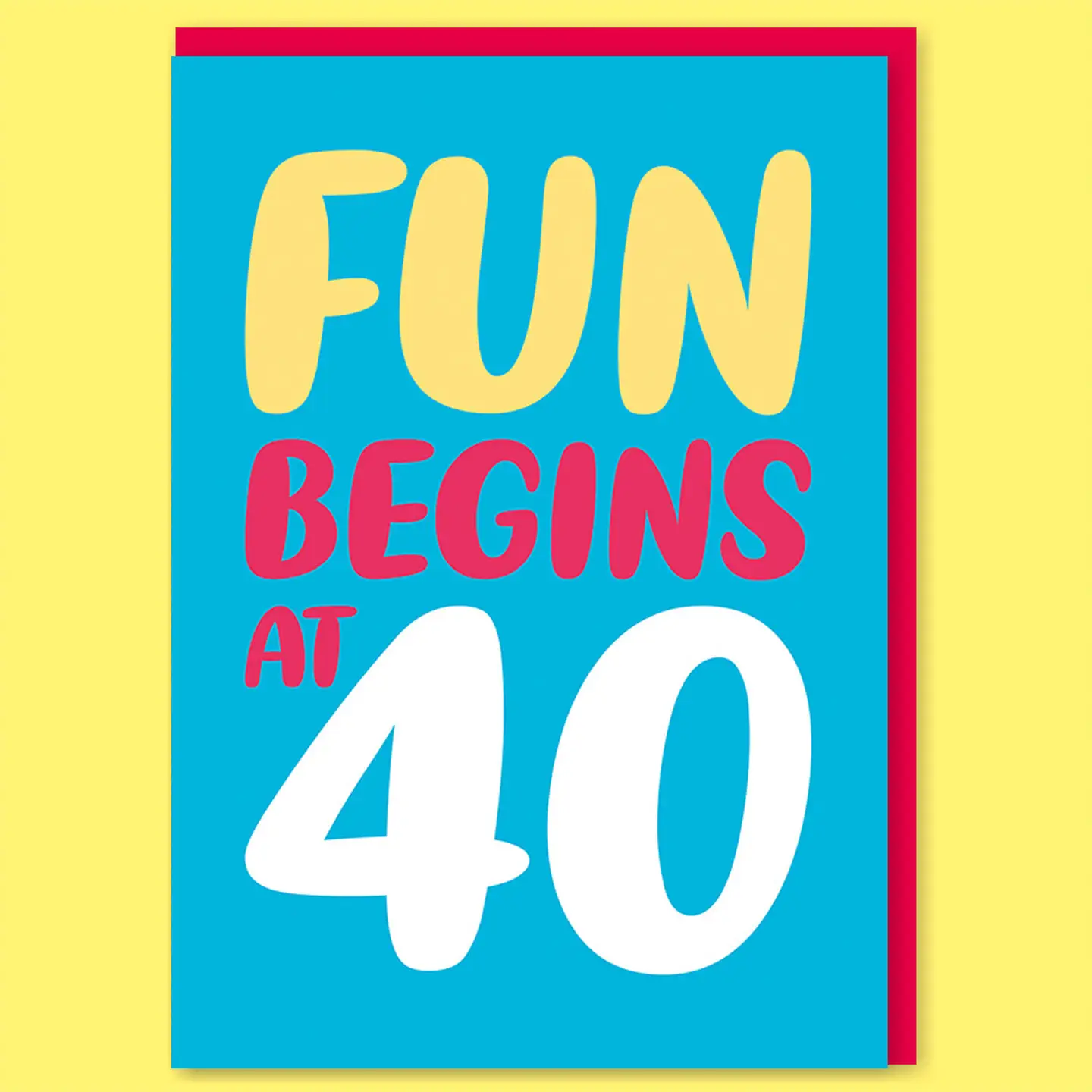 Here's the perfect birthday card for someone who's turned forty. Now you can remind them how old they are. A bright blue birthday card with yellow, red and white rounded letters that read Fun begins at 40.