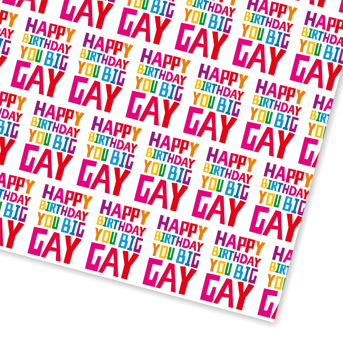 Here's some colourful gay wrapping paper for your big gay friend for their best birthday ever! Bright white wrapping paper with the words 'Happy birthday you big gay' in capitalised angular rainbow font repeated across the entire paper.