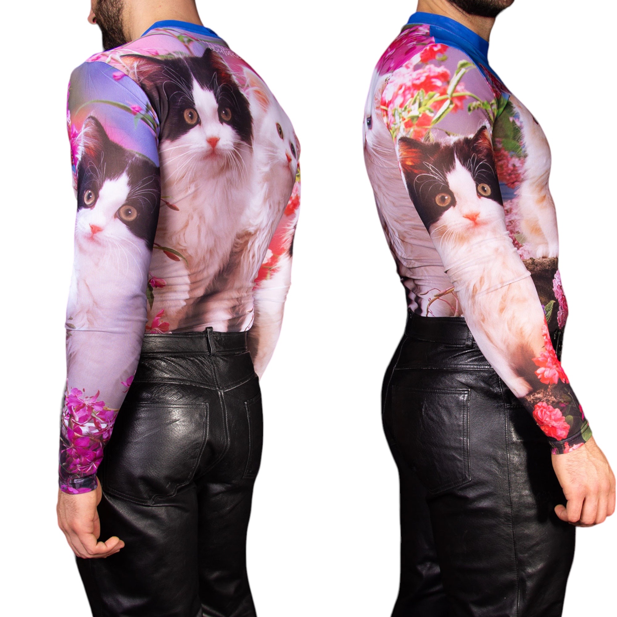 Cropped mesh top with long sleeves, in Pussy Cat designs for Kitty Cat lovers. Fabric: 90% Polyester, 10% Elastane # CATS ALL YEAR ROUND BABY! MEOW Bodysuit with cutouts and rainbow chain straps, in 69ing unicorn yin yang print. Fabric: 85% Polyester, 15% Elastane David is 172cm tall and is wearing size M.