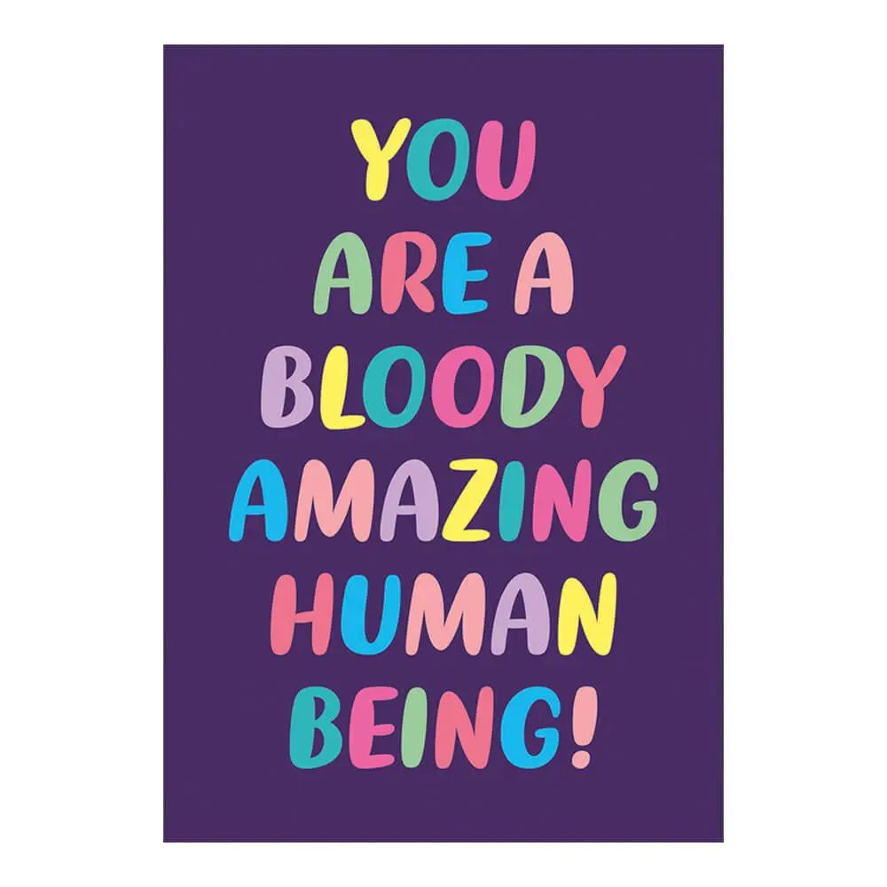 Sometimes we all need a pick up and here's the postcard to do that. We're all amazing in our own way and just need reminding from time to time. A dark blue postcard with pastel multicolored text in the middle that reads You are a bloody amazing human being.