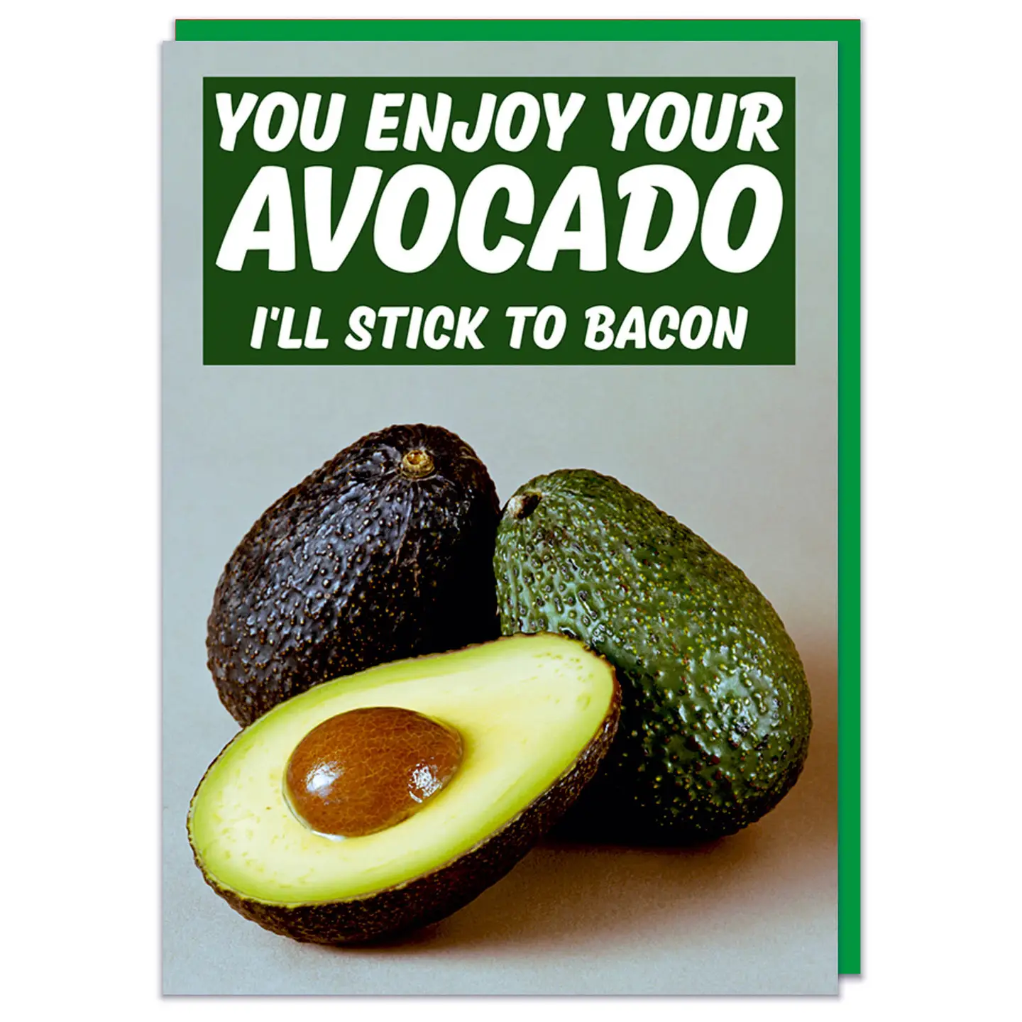 Is it me or is the avocado simply everywhere? Avocado smoothies, avocado on toast, avocado chocolate pots I saw the other day. And then there are the avocado evangelicals. I think they need this card. Me, I love an avocado, sometimes I'll have it with bacon too. A greeting card with a dull picture of avocados. White text in a green box above reads You enjoy your avocado. I'll stick to bacon.